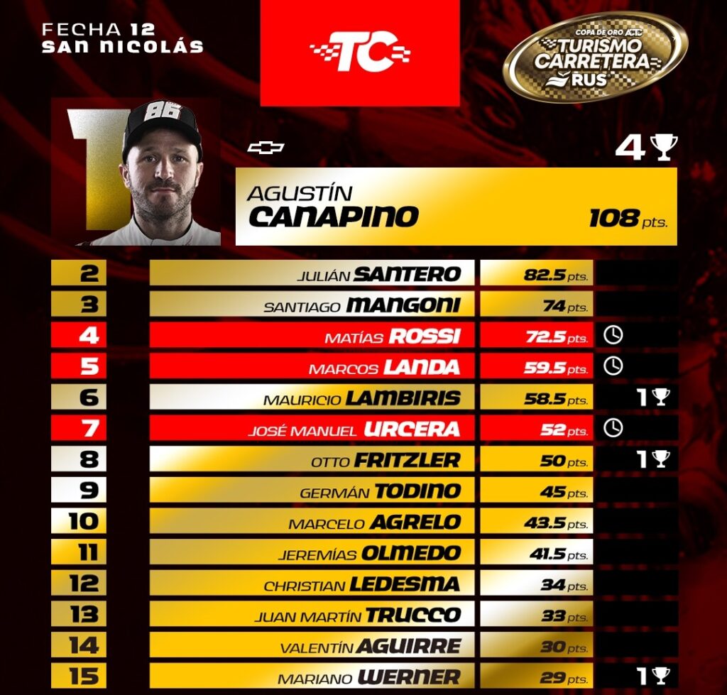 Agustín Canapino a bordo de su Chevrolet Camaro, domina la Copa de Oro con una sólida actuación que lo posiciona como el principal candidato al campeonato. Sin embargo, la ventaja no le permite relajarse, ya que Julián Santero, con su Ford Mustang, se mantiene al acecho, ejerciendo una presión constante y demostrando que no dará el brazo a torcer hasta el final.